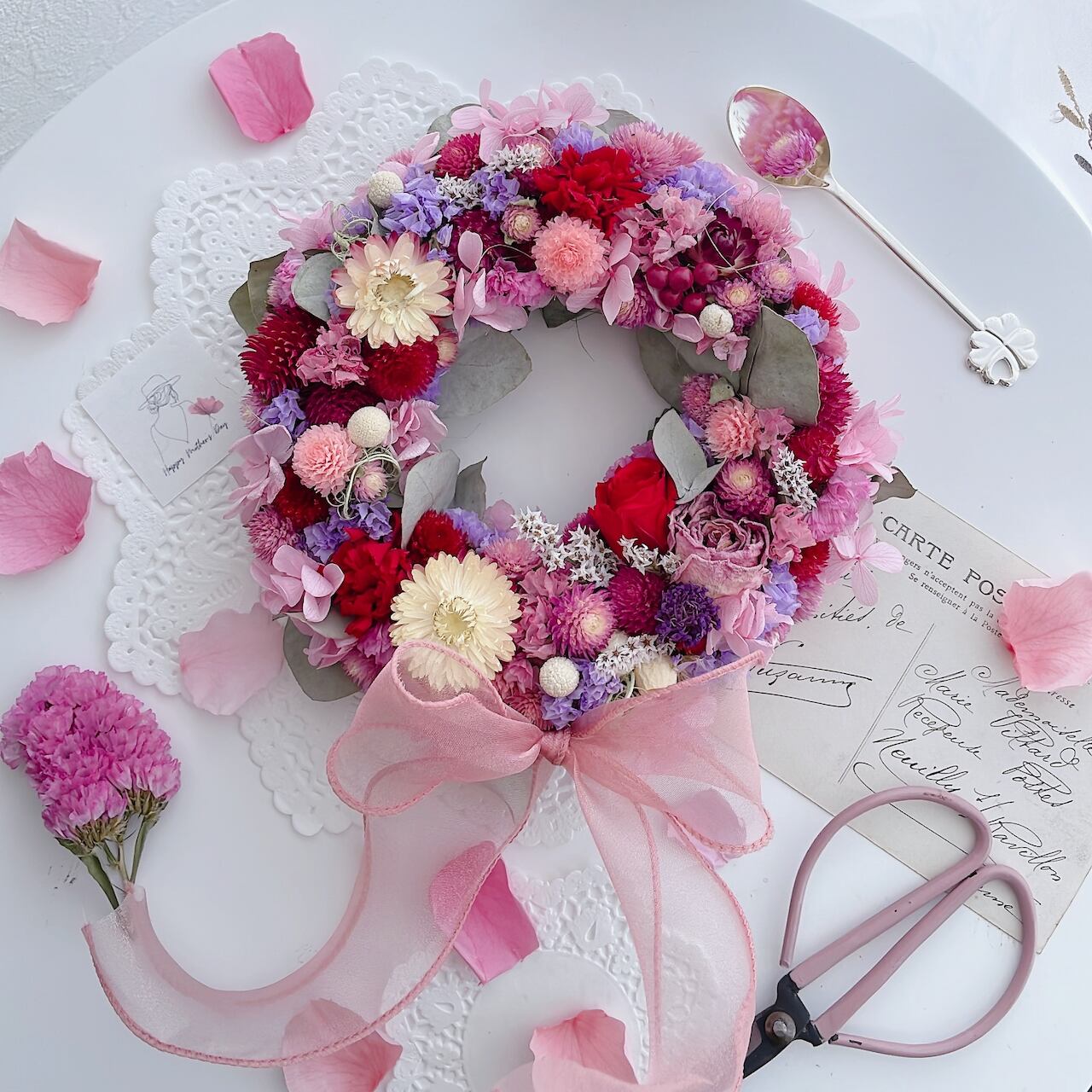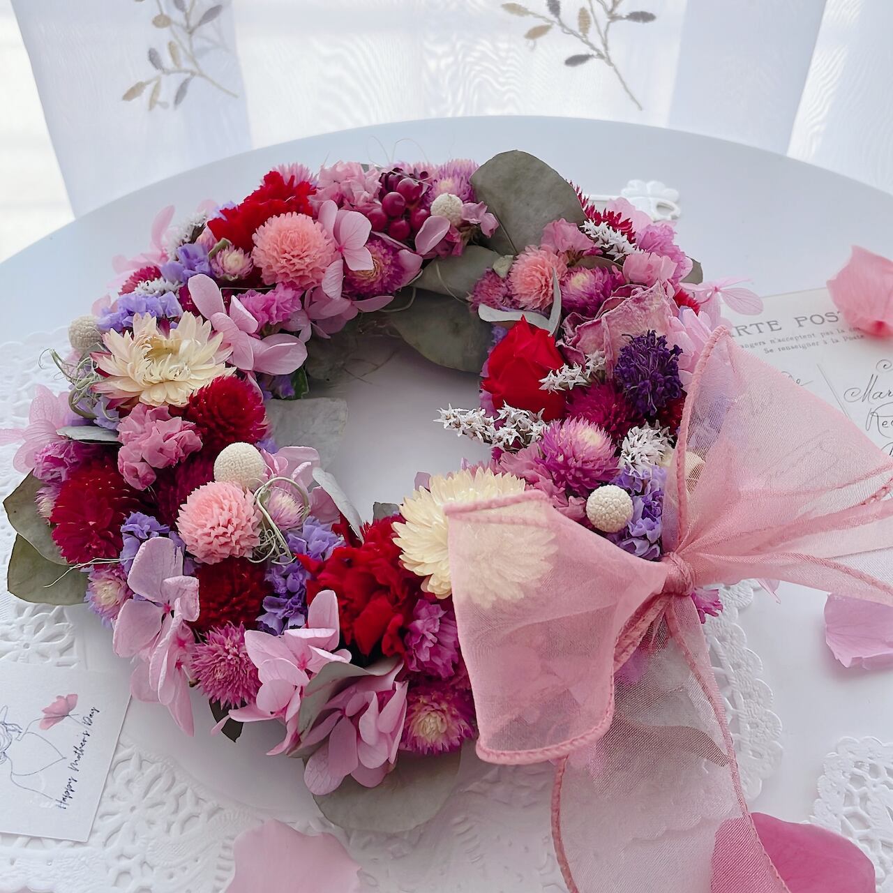 母の日の贈り物に〜赤いカーネーションとピンクのお花たちのリース