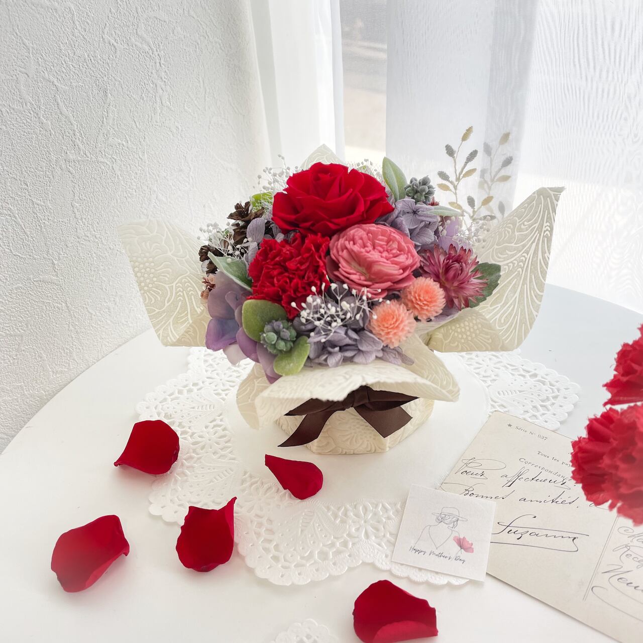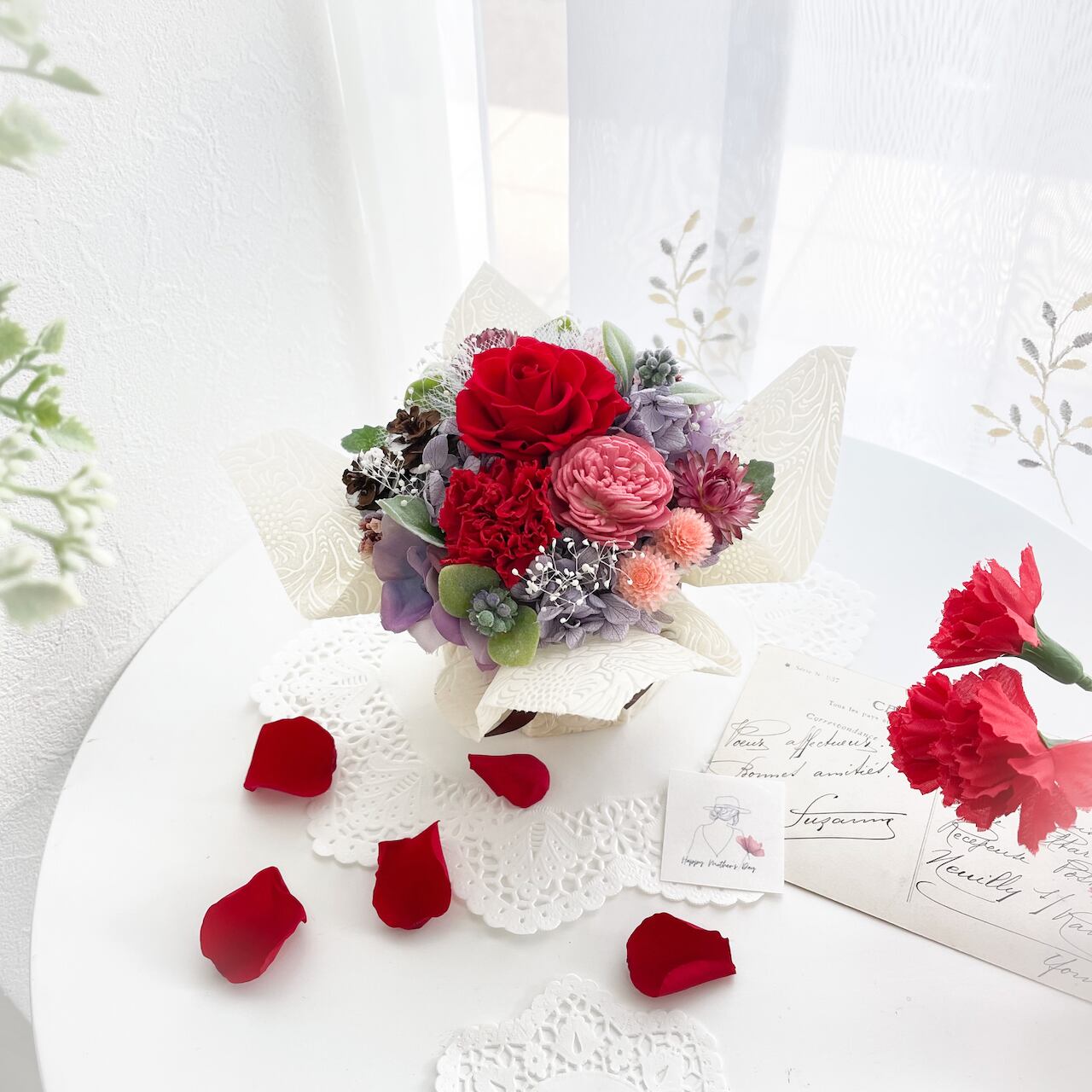 母の日の贈り物に〜赤いカーネーションとバラのアレンジ